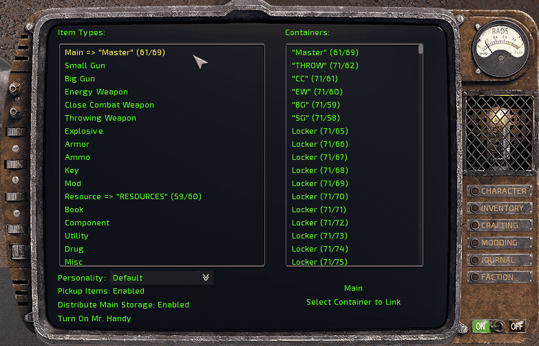 After the cleanup phase, the robot can also pull-out items from a “Main storage” to resort when this option is enabled. When everything is gathered, Handy begins to Sort the Loot. All the loot item types that have linked containers will have their items delivered to those containers. If there is no container linked, or the container does not exist anymore, the robot will deliver it to the “Main storage” instead. Suppose a main storage is not linked either, it will drop unsorted items on the ground for you.