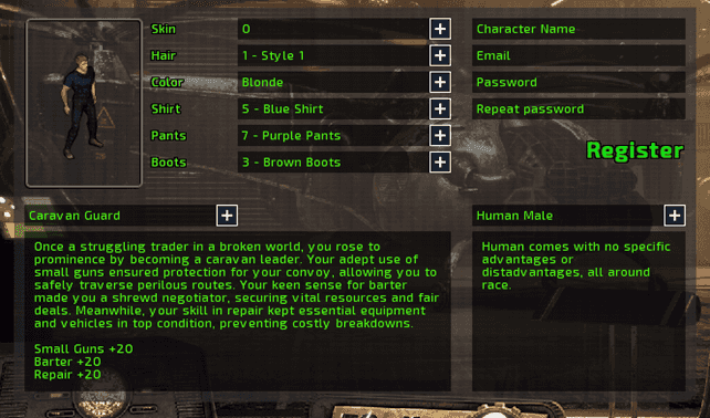 To start your journey in the Wasteland, you must register your character. Start by choosing your race: Human Male, Human Female, Ghoul and or Mutant. Then choose the cosmetics you like by setting Skin tone, Hair, Colors, Shirt, Pants, and Boots. Write your character name and password. Email address is optional, but if you ever forgot your password, then you will need email to reset it.