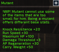 Mutant shaders, textures, cosmetics and animations for armor and weapons were added. Some are still being developed. Mutants can use armors made of leather, and metallic materials. Mutant weapon restrictions mostly exclude small guns and some melee weapons from being used. Usable melee weapons are all Sledge type weapons (Pickaxe Axe, Sledgehammer super sledge etc.) and unarmed (Power fist, knuckles, boxing gloves)