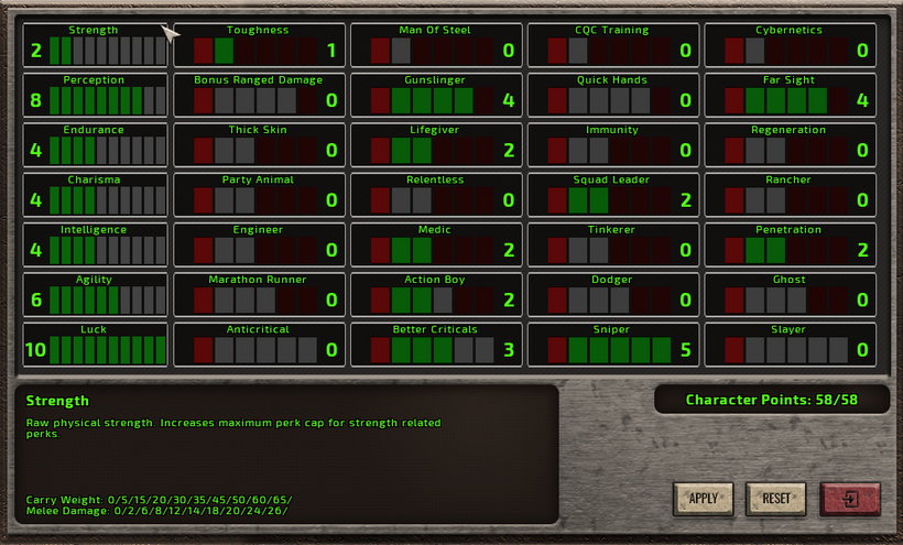 We’ve been hard at work and redesigning the core of character builds. This has led to a significant rewrite, merge of perks, and implementation of S.P.E.C.I.A.L.